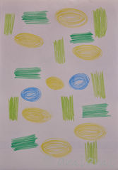 ふだんはのんびりペースな彼女だが、好きなことには猪突猛進。鉛筆を持つと、描く感触をじっくり確かめるように、ぐるぐると不思議な模様を描き始める。色鉛筆を目の前に見せると、芯が尖った色から手に取る。そして、先が丸くなるまで熱心に描く。両ききで、使う手によって描く模様は違う。丸や8の字、色の名前など、その時々で表れる絵柄が組み合わさり、一つの作品になっていく。